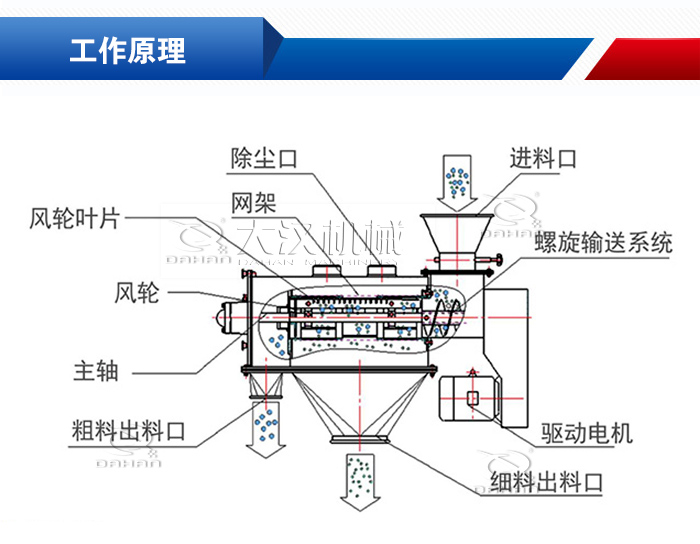臥式氣流篩結構:振動電機、機座、篩箱、進出料推進裝置等。其篩網(wǎng)為圓筒狀,置于機體內,物料通過螺旋輸送系統(tǒng)后,和氣流混合、霧化進入氣流篩分機網(wǎng)筒內部,再通過網(wǎng)筒內部的風輪葉片使物料同時受到離心力和旋風推進力,從而迫使物料噴射過網(wǎng),由細料排出口排出,不能過網(wǎng)的物料沿著網(wǎng)筒壁從粗料排出口排出。