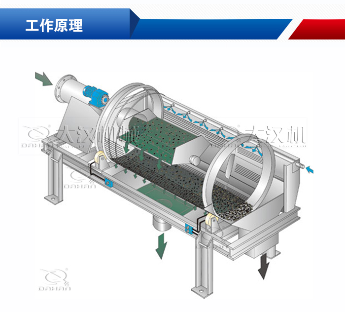 電動(dòng)機(jī)經(jīng)減速器與滾筒裝置通過(guò)聯(lián)軸器連接在一起,驅(qū)動(dòng)滾筒裝置繞其軸線轉(zhuǎn)動(dòng)。當(dāng)物料進(jìn)入滾筒裝置后,由于滾筒裝置的傾斜與轉(zhuǎn)動(dòng),使篩面上的物料翻轉(zhuǎn)與滾動(dòng)的同時(shí),自上而下通過(guò)分級(jí)篩網(wǎng)析出,由于篩網(wǎng)規(guī)格不同,物料直接被分離篩選,合格物料(篩下物)經(jīng)滾筒外圓的篩網(wǎng)排出,不合格的物料(篩上物))經(jīng)滾筒末端排出。由于物料在滾筒內(nèi)的翻轉(zhuǎn)、滾動(dòng),使卡在篩孔中的物料被彈出,可防止篩孔堵塞。