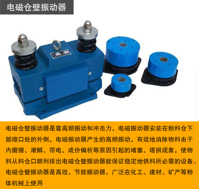 電磁倉壁振動器是高效、能耗低振動器,廣泛在化工、建材、礦產(chǎn)等粉體機(jī)械上使用。使用電磁振動器作疏料裝置,結(jié)構(gòu)簡單,下料流暢,能穩(wěn)定給料系統(tǒng)。電磁振動器也可用在其它需振動源的機(jī)械上。廣泛地應(yīng)用于礦山、冶金、化工、建材、機(jī)械等各行業(yè)中。