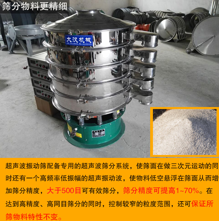 對(duì)于一些細(xì)粉、微粉類(lèi)物料普通的振動(dòng)篩很難完成的篩分,特別是500目以上的物料,普通的振動(dòng)篩分機(jī)更難達(dá)到, 因?yàn)樵诤Y分中它們?nèi)菀壮霈F(xiàn)結(jié)塊和漏料的情況。超聲波振動(dòng)篩能很好的避免。超聲波振動(dòng)篩配備專(zhuān)用的超聲波篩分系統(tǒng),使篩面在做三次元運(yùn)動(dòng)的同時(shí)還有一個(gè)高頻率低振幅的超聲振動(dòng)波,使物料低空懸浮在篩面從而增加篩分精度,篩分精度可提高1~70%。在達(dá)到高精度、高網(wǎng)目篩分的同時(shí),控制較窄的粒度范圍,還可保證所篩物料特性不變。比普通的旋振篩多了一套超聲波發(fā)生裝置,該裝置安裝在網(wǎng)架的下端,可以通過(guò)該裝置對(duì)較為精細(xì)的物料進(jìn)行篩分,物料不僅受到振動(dòng)電機(jī)的振動(dòng),而且還受到超聲波換能器的機(jī)械振動(dòng),因此篩分物料較為精細(xì)。
