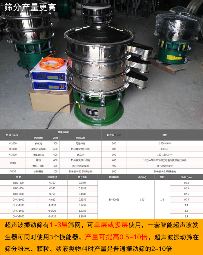 超聲波振動(dòng)篩有1~3層篩網(wǎng),可單層或多層使用,一套智能超聲波發(fā)生器可同時(shí)使用3個(gè)換能器,產(chǎn)量可提高0.5~10倍,超聲波振動(dòng)篩在篩分粉末、顆粒、漿液類(lèi)物料時(shí)產(chǎn)量是普通振動(dòng)篩的2~10倍。而且為了盡可能滿足各行業(yè)對(duì)精細(xì)篩分的需求,超聲波振動(dòng)篩的型號(hào)種類(lèi)多樣,不同型號(hào)的超聲波振動(dòng)篩對(duì)應(yīng)著不同的篩分面積,相應(yīng)的篩分效率、處理量也相差很大,可以完全滿足不同行業(yè)的細(xì)粉篩分需求。