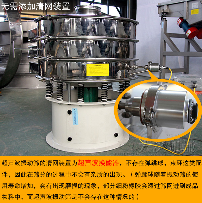 超聲波振動(dòng)篩的清網(wǎng)裝置為超聲波換能器,不存在彈跳球,束環(huán)這類(lèi)配件,因此在篩分的過(guò)程中不會(huì)有雜質(zhì)的出現(xiàn)。(彈跳球隨著振動(dòng)篩的使用壽命增加,會(huì)有出現(xiàn)磨損的現(xiàn)象,部分細(xì)粉橡膠會(huì)透過(guò)篩網(wǎng)進(jìn)到成品物料中,而超聲波振動(dòng)篩是不會(huì)存在這種情況的)