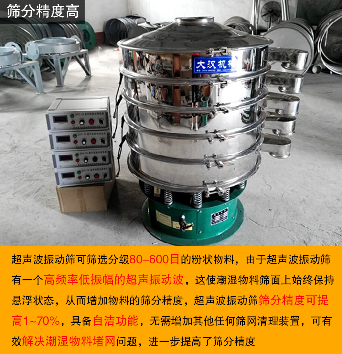 超聲波振動篩可篩選分級80-600目的粉狀物料,由于超聲波振動篩有一個高頻率低振幅的超聲振動波,這使潮濕物料篩面上始終保持懸浮狀態(tài),從而增加物料的篩分精度,超聲波振動篩篩分精度可提高1~70%,具備自潔功能,無需增加其他篩網(wǎng)清理裝置,可有效解決潮濕物料堵網(wǎng)問題,進一步提高了篩分精度。