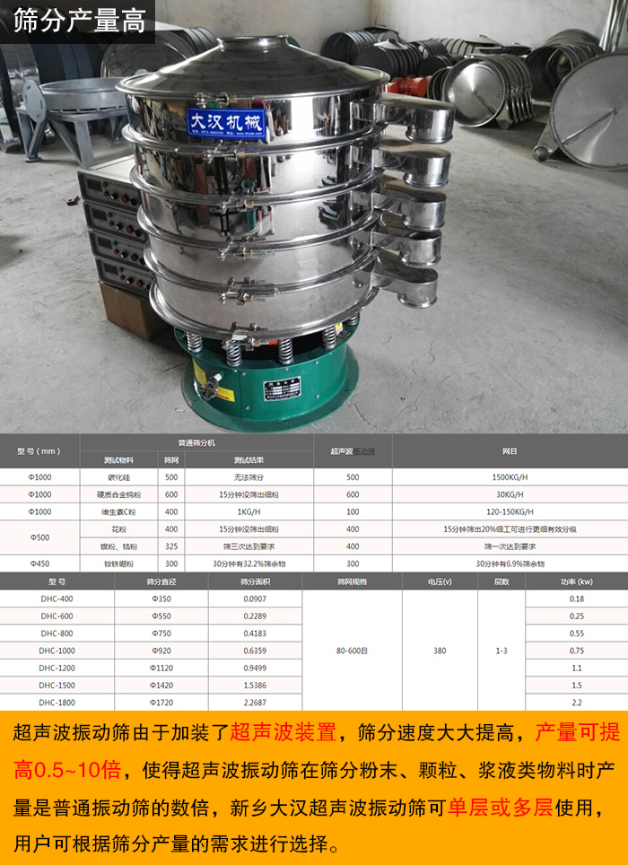 超聲波振動篩由于加裝了超聲波裝置,篩分速度大大提高,產(chǎn)量可提高0.5~10倍,使得超聲波振動篩在篩分粉末、顆粒、漿液類物料時產(chǎn)量是普通振動篩的數(shù)倍,新鄉(xiāng)大漢超聲波振動篩可單層或多層使用,用戶可根據(jù)篩分產(chǎn)量的需求進行選擇。