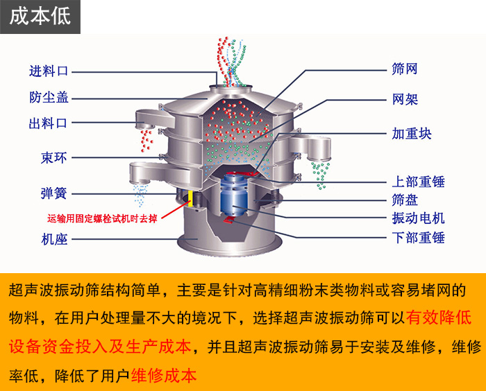 超聲波振動篩結(jié)構(gòu)簡單,主要是針對高精細粉末類物料或容易堵網(wǎng)的物料,在用戶處理量不大的境況下,選擇超聲波振動篩可以有效降低設(shè)備資金投入及生產(chǎn)成本,并且超聲波振動篩易于安裝及維修,維修率低,降低了用戶維修成本。
