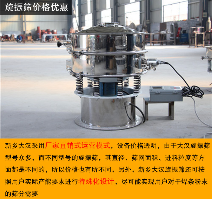 新鄉(xiāng)大漢采用廠家直銷式運營模式,設(shè)備價格透明,由于大漢旋振篩型號眾多,主要有DH-600、DH-800、DH-1000、DH-1200、DH-1500、DH-1800、DH-2000,而不同型號的旋振篩,其直徑、篩網(wǎng)面積、進(jìn)料粒度等方面都是不同的,所以價格也有所不同,另外,新鄉(xiāng)大漢旋振篩還可按照用戶實際產(chǎn)能要求進(jìn)行特殊化設(shè)計,盡可能實現(xiàn)用戶對于焊條粉末的篩分需要,所以,具體旋振篩價格這里無法給出詳細(xì)的數(shù)字,具體價格根據(jù)用戶選型情況計算。