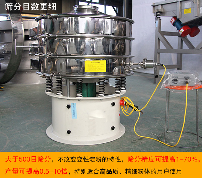 超聲波振動(dòng)篩將超聲波發(fā)生器與旋振篩結(jié)合在一起,將220V、50Hz或110V、60Hz電能轉(zhuǎn)化為18KHz的高頻電能,輸入超聲換能器,將其變成18KHz機(jī)械振動(dòng),大于500目篩分,不改變變性淀粉的特性,篩分精度可提高1-70%,產(chǎn)量可提高0.5-10倍,特別適合高品質(zhì)、精細(xì)粉體的用戶(hù)使用。