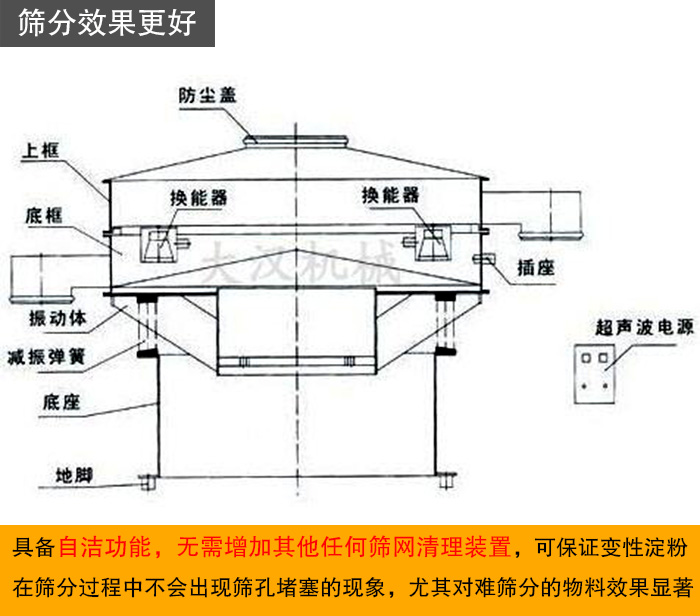 超聲波振動(dòng)篩是旋振篩的改良設(shè)備,是為了解決高精細(xì)粉末堵網(wǎng)問(wèn)題而設(shè)計(jì)的,具備自潔功能,無(wú)需增加其他篩網(wǎng)清理裝置,可保證變性淀粉在篩分過(guò)程中不會(huì)出現(xiàn)篩孔堵塞的現(xiàn)象,尤其對(duì)難篩分的物料效果顯著。