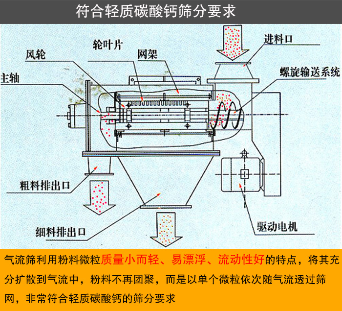 氣流篩利用粉料微粒質(zhì)量小而輕、易漂浮、流動(dòng)性好的特點(diǎn),將其充分?jǐn)U散到氣流中,粉料不再團(tuán)聚,而是以單個(gè)微粒依次隨氣流透過篩網(wǎng),非常符合輕質(zhì)碳酸鈣的篩分要求。