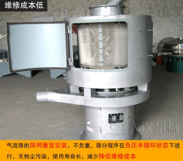 氣流篩的篩網(wǎng)垂直安裝,不負(fù)重,篩分程序在負(fù)壓半循環(huán)狀態(tài)下進(jìn)行,無粉塵污染,使用壽命長,減少降低維修成本。