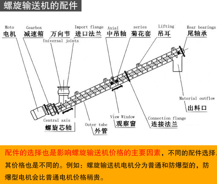 螺旋輸送機(jī)主要由料槽、螺旋葉片和轉(zhuǎn)動(dòng)軸組成的螺旋體、兩端軸承、中間懸掛軸承及驅(qū)動(dòng)裝置組成。配件的選擇也是影響螺旋輸送機(jī)價(jià)格的主要因素,不同的配件選擇,其價(jià)格也是不同的。例如:螺旋輸送機(jī)電機(jī)分為普通和防爆型的,防爆型電機(jī)會(huì)比普通電機(jī)價(jià)格稍貴。