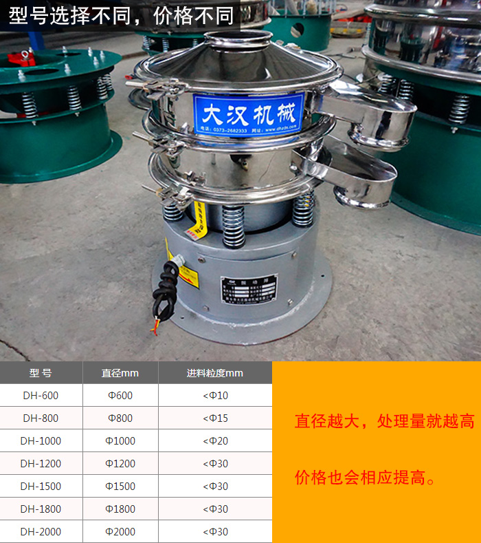 新鄉(xiāng)大漢食品振動篩常見型號有:直徑400mm、600mm、800mm、1000mm、1200mm、1500mm、1800mm等,不同型號的食品振動篩,其篩面直徑也是不一樣的,所以這對食品振動篩的處理量有一定的影響,直徑越大,處理量就越高,價格也會相應(yīng)提高。