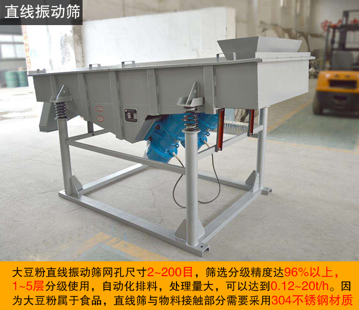 大豆粉直線振動篩網(wǎng)孔尺寸2~200目,篩選分級精度達96%以上,1~5層分級使用,自動化排料,處理量大,可以達到0.12~20t/h。因為大豆粉屬于食品,直線篩與物料接觸部分需要采用304不銹鋼材質(zhì)。