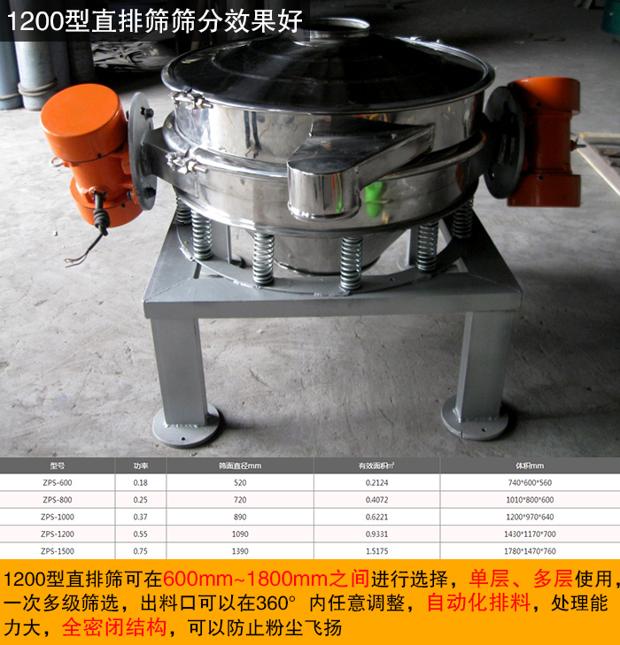 1200型直排篩的兩臺振動電機對稱安裝在直排篩兩側(cè),振動電機上、下端裝有偏心重錘將振動電機的旋轉(zhuǎn)運動變?yōu)樗?、垂直、傾斜以及離心作用的多作用力重疊,再將這種作用力傳遞給篩面,從而達到篩分的目的。1200型直排篩可在600mm~1800mm之間進行選擇,單層、多層使用,一次多級篩選,出料口可以在360°內(nèi)任意調(diào)整,自動化排料,處理能力大,全密閉結(jié)構(gòu),可以防止粉塵飛揚。