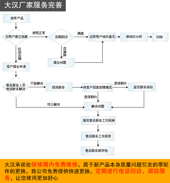 新鄉(xiāng)大漢從售前、售中、售后始終堅持把每一細節(jié)做到全面細致,以便快速有效解決用戶所需,而且大漢承諾在保修期內(nèi)免費維修,屬于新產(chǎn)品本身質(zhì)量問題引發(fā)的零配件的更換,我公司免費提供快速更換。定期進行電話回訪,跟蹤服務(wù),讓您使用更加舒心。大漢完善的服務(wù)渠道和嚴(yán)密的服務(wù)程序,能為您提供優(yōu)質(zhì)的服務(wù)。