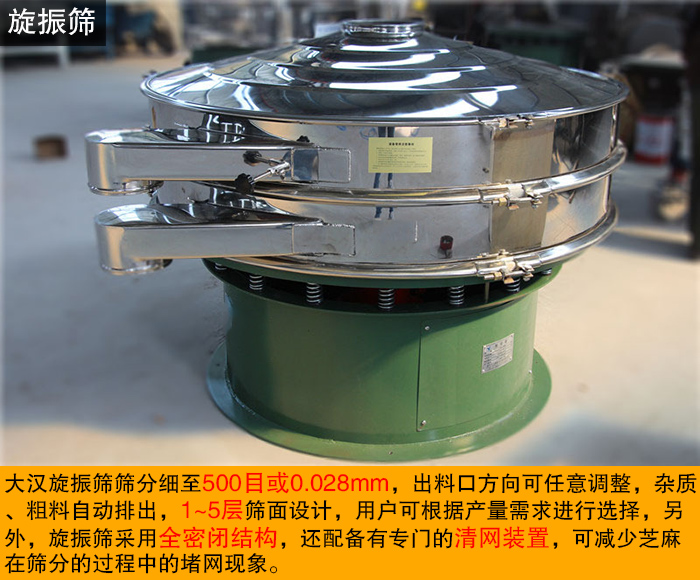 大漢旋振篩篩分細(xì)至500目或0.028mm,是一種高精度細(xì)粉篩分設(shè)備,出料口方向可任意調(diào)整,雜質(zhì)、粗料自動(dòng)排出,可連續(xù)作業(yè),1~5層篩面設(shè)計(jì),用戶可根據(jù)產(chǎn)量需求進(jìn)行選擇,另外,旋振篩采用全密閉結(jié)構(gòu),還配備有專門(mén)的清網(wǎng)裝置,可減少芝麻在篩分的過(guò)程中的堵網(wǎng)現(xiàn)象,極大的提高了篩機(jī)的篩分產(chǎn)量和篩分效率。