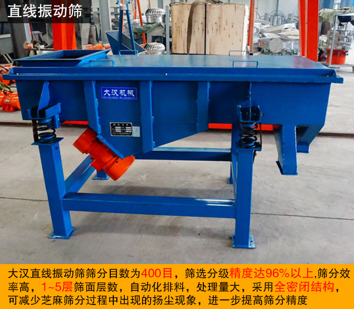 大漢直線振動(dòng)篩篩分目數(shù)為400目,篩選分級(jí)精度達(dá)96%以上,篩分效率高,1~5層篩面層數(shù),自動(dòng)化排料,處理量大,采用全密閉結(jié)構(gòu),可減少芝麻篩分過(guò)程中出現(xiàn)的揚(yáng)塵現(xiàn)象,進(jìn)一步提高篩分精度。