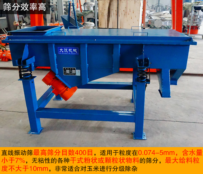 直線振動篩高篩分目數(shù)400目,適用于粒度在0.074-5mm,含水量小于7%,無粘性的各種干式粉狀或顆粒狀物料的篩分,大給料粒度不大于10mm,非常適合對玉米進行分級除雜。