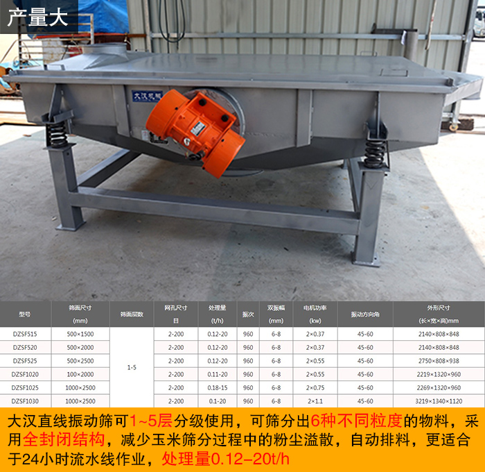 大漢直線振動篩可1~5層分級使用,可篩分出6種不同粒度的物料,采用全封閉結(jié)構(gòu),減少玉米篩分過程中的粉塵溢散,自動排料,更適合于24小時流水線作業(yè),處理量0.12-20t/h。