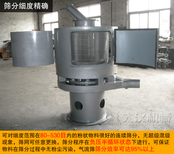 氣流篩可對細度范圍在80-530目內(nèi)的粉狀物料很好的連續(xù)篩分,無超級混級現(xiàn)象,篩網(wǎng)可任意更換,篩分程序在負壓半循環(huán)狀態(tài)下進行,可保證物料在篩分過程中無粉塵污染,氣流篩篩分效率可達95%以上。
