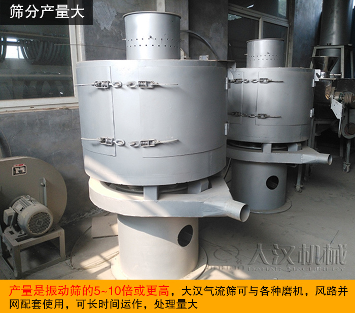 氣流篩利用了微細粉料的質(zhì)量小、輕、流動性好、易飄浮等特點,通過將粉料充分擴散到氣流中,使粉料以單個微粒依次隨氣流透過篩網(wǎng),實現(xiàn)對粉料的篩分目的,產(chǎn)量是振動篩的5~10倍或更高,大漢氣流篩可與各種磨機,風(fēng)路并網(wǎng)配套使用,可長時間運作,處理量大。