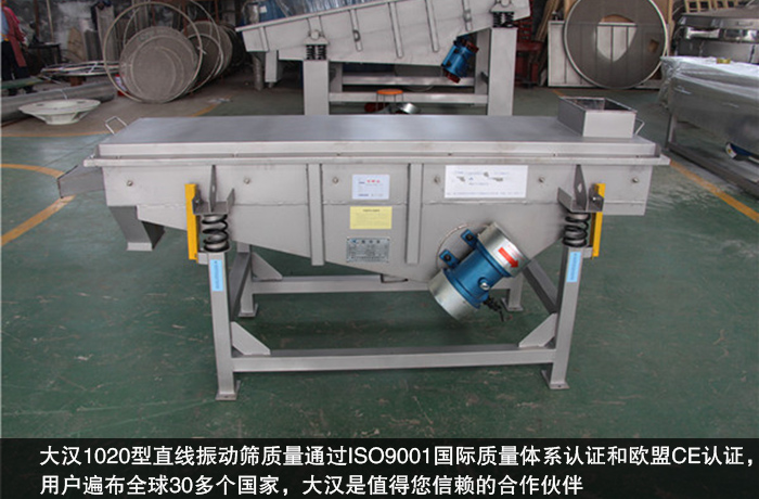 大漢在豐富的生產經驗上和成熟的技術工藝上,始終堅持把握產品的合理定位,對于設備生產、加工、裝配等環(huán)節(jié)進行層層監(jiān)控,以確保優(yōu)質的產品質量,大漢1020型直線振動篩質量通過ISO9001國際質量體系認證和歐盟CE認證,用戶遍布全球30多個國家,大漢是值得您信賴的合作伙伴。