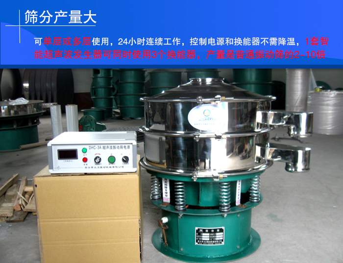 超聲波振動(dòng)篩可單層或多層使用,24小時(shí)連續(xù)工作,控制電源和換能器不需降溫,1套智能超聲波發(fā)生器可同時(shí)使用3個(gè)換能器,產(chǎn)量是普通振動(dòng)篩的2-10倍。
