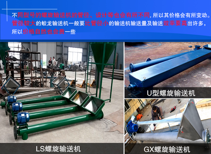 新鄉(xiāng)大漢生產(chǎn)的蛟龍螺旋輸送機主要有LS螺旋輸送機、U型螺旋輸送機、GX螺旋輸送機等,不同型號的螺旋輸送機的管徑、設(shè)計等也會有所不同, 所以其價格會有所變動。管徑較大的蛟龍輸送機一般要比管徑小的輸送機輸送量及輸送效率要高出許多,所以價格自然也會貴一些。