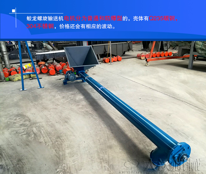 新鄉(xiāng)大漢蛟龍螺旋輸送機電機分為普通和防爆型的,殼體有Q235碳鋼,304不銹鋼,價格還會有相應(yīng)的波動。普通電機的輸送機價格比防爆電機的輸送機價格便宜,而Q235材質(zhì)的螺旋輸送機相比304不銹鋼材質(zhì)的也會便宜一些,所以具體的蛟龍螺旋輸送機價格還是得根據(jù)用戶的選用情況進行計算。