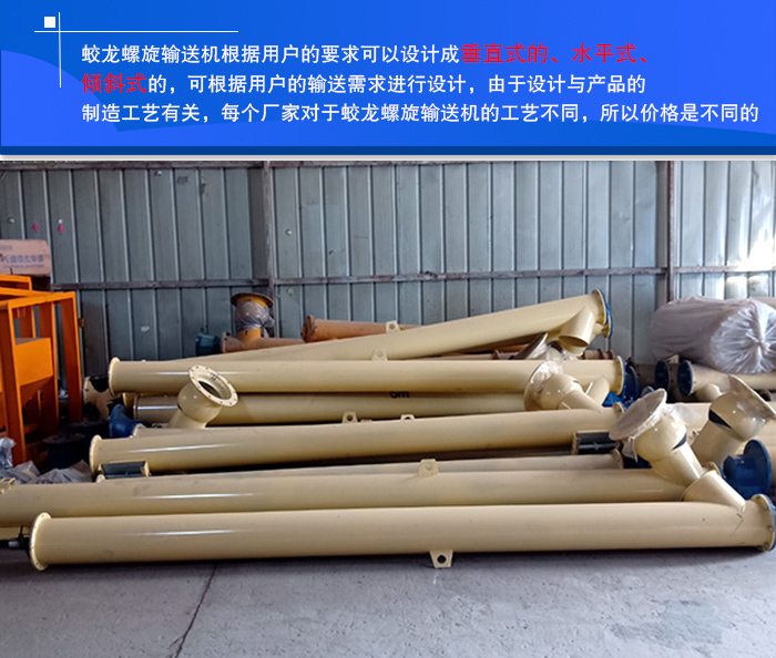 蛟龍螺旋輸送機根據(jù)用戶的要求可以設(shè)計成垂直式的、水平式、傾斜式的,可根據(jù)用戶的輸送需求進行設(shè)計,由于設(shè)計與產(chǎn)品的制造工藝有關(guān),每個廠家對于蛟龍螺旋輸送機的工藝不同,這就決定了蛟龍螺旋輸送機價格的高低。