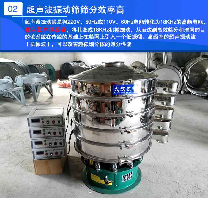 超聲波振動篩是將220V、50Hz或110V、60Hz電能轉(zhuǎn)化為18KHz的高頻電能,輸入超聲換能器,將其變成18KHz機械振動,從而達到高效篩分和清網(wǎng)的目的該系統(tǒng)在傳統(tǒng)的基礎(chǔ)上在篩網(wǎng)上引入一個低振幅、高頻率的超聲振動波(機械波),可以改善超微細(xì)分體的篩分性能,超聲波振動篩無需增加清網(wǎng)裝置,篩分效率高。