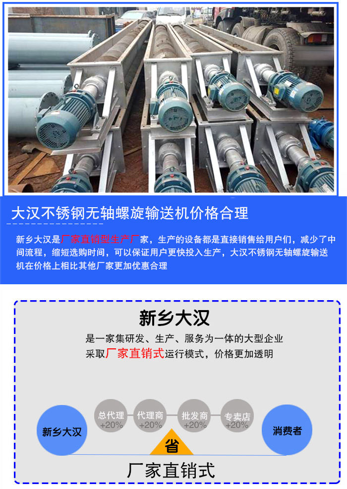 新鄉(xiāng)大漢是廠家直銷型生產廠家,生產的設備都是直接銷售給用戶們,減少了中間流程,縮短選購時間,可以保證用戶更快投入生產,大漢不銹鋼無軸螺旋輸送機在價格上相比其他廠家更加優(yōu)惠合理。