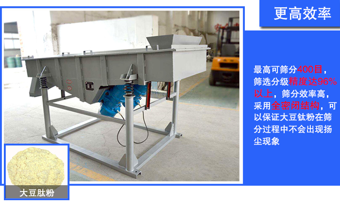 直線振動(dòng)篩高可篩分400目,篩選分級(jí)精度達(dá)96%以上,篩分效率高,采用全密閉結(jié)構(gòu),可以保證大豆鈦粉在篩分過(guò)程中不會(huì)出現(xiàn)揚(yáng)塵現(xiàn)象,進(jìn)一步提高篩分精度和效率。