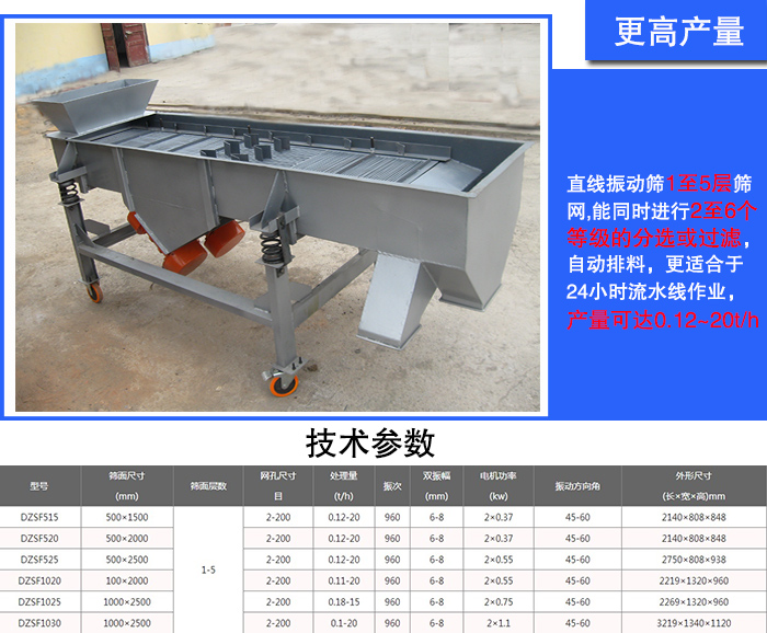 直線振動(dòng)篩1至5層篩網(wǎng),能同時(shí)進(jìn)行2至6個(gè)等級(jí)的分選或過(guò)濾,自動(dòng)排料,更適合于24小時(shí)流水線作業(yè),產(chǎn)量可達(dá)0.12~20t/h。