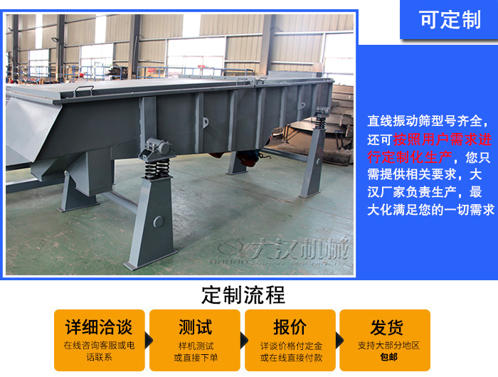 直線振動(dòng)篩型號(hào)齊全,還可按照用戶需求進(jìn)行定制化生產(chǎn),您只需提供相關(guān)要求,大漢廠家負(fù)責(zé)生產(chǎn),大化滿足您的一切需求。