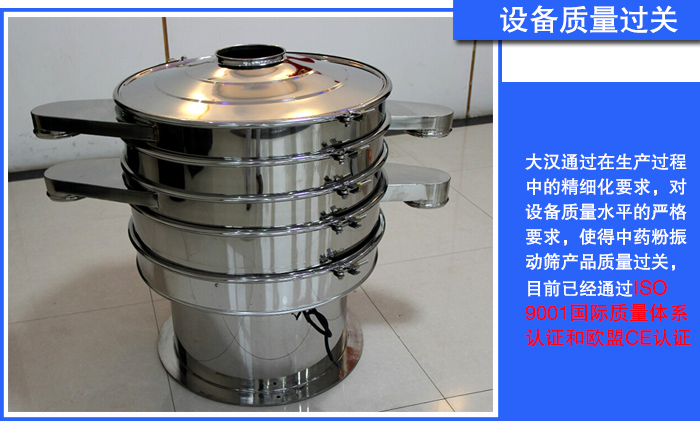 新鄉(xiāng)大漢創(chuàng)立20多年以來始終堅(jiān)信:只有過硬的產(chǎn)品質(zhì)量才能讓企業(yè)贏得市場,只有過硬的產(chǎn)品質(zhì)量才能讓企業(yè)獲得更好的效益,也只有過硬的產(chǎn)品質(zhì)量才能實(shí)現(xiàn)企業(yè)的可持續(xù)發(fā)展。大漢通過在生產(chǎn)過程中的精細(xì)化要求,對設(shè)備質(zhì)量水平的嚴(yán)格要求,使得中藥粉振動篩產(chǎn)品質(zhì)量過關(guān),目前已經(jīng)通過ISO9001國際質(zhì)量體系認(rèn)證和歐盟CE認(rèn)證。