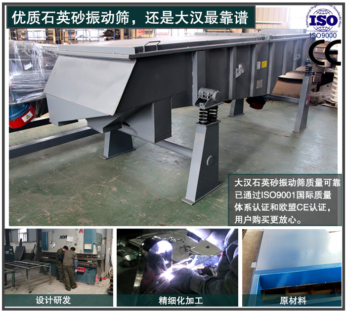 新鄉(xiāng)大漢作為一家擁有20多年生產(chǎn)經(jīng)驗的振動篩廠家,設備配置先進,生產(chǎn)經(jīng)驗豐富,在產(chǎn)品的設計、技術、工藝及選材等方面時刻將質(zhì)量放在首位,不因利潤的誘惑而放棄對質(zhì)量的追求,大漢石英砂振動篩質(zhì)量可靠,已通過ISO9001國際質(zhì)量體系認證和歐盟CE認證,用戶購買更放心。