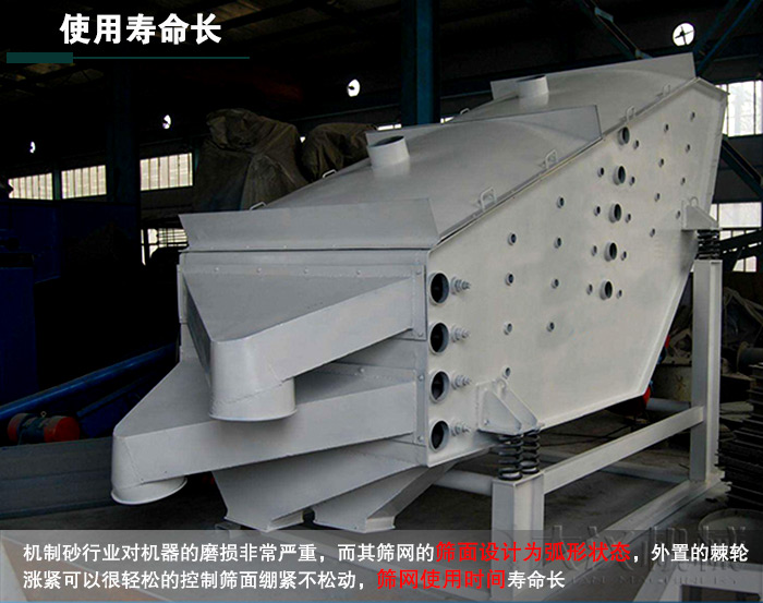 機(jī)制砂行業(yè)對機(jī)器的磨損非常嚴(yán)重,因此具備長久使用壽命的振動篩會大大減少企業(yè)的維修費(fèi)用,而概率篩篩網(wǎng)的篩面設(shè)計為弧形狀態(tài),外置的棘輪漲緊可以很輕松的控制篩面繃緊不松動,篩網(wǎng)使用時間壽命長。