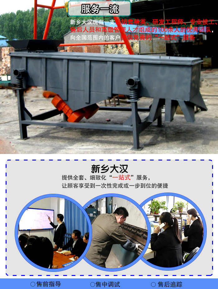 新鄉(xiāng)大漢現有一支由銷售精英、研發(fā)工程師、專業(yè)技工、售后人員和管理人才組成的近百人的團隊,向全國范圍內的客戶提供免費的“一站式”服務,從選型、試機、安裝、調試、維修到定期回訪等每一個服務環(huán)節(jié)都盡可能地貼近客戶,為用戶提供高質量、可靠、快捷以及連續(xù)的服務。