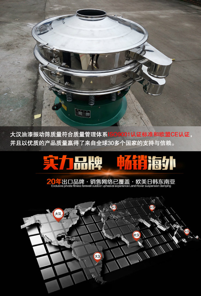 市場(chǎng)上生產(chǎn)油漆振動(dòng)篩的廠家有很多,但要如何在激烈的競(jìng)爭(zhēng)中脫穎而出,相信首先還是得靠?jī)?yōu)質(zhì)的產(chǎn)品質(zhì)量取勝,新鄉(xiāng)大漢始終相信產(chǎn)品質(zhì)量是制造和檢驗(yàn)出來(lái)的,也只有在生產(chǎn)過(guò)程中嚴(yán)格把關(guān),在材料及零配件使用上嚴(yán)格挑選才能更加具備競(jìng)爭(zhēng)力,大漢油漆振動(dòng)篩質(zhì)量符合質(zhì)量管理體系ISO9001認(rèn)證標(biāo)準(zhǔn)和歐盟CE認(rèn)證,并且以優(yōu)質(zhì)的產(chǎn)品質(zhì)量贏得了來(lái)自全球30多個(gè)國(guó)家的支持與信賴。