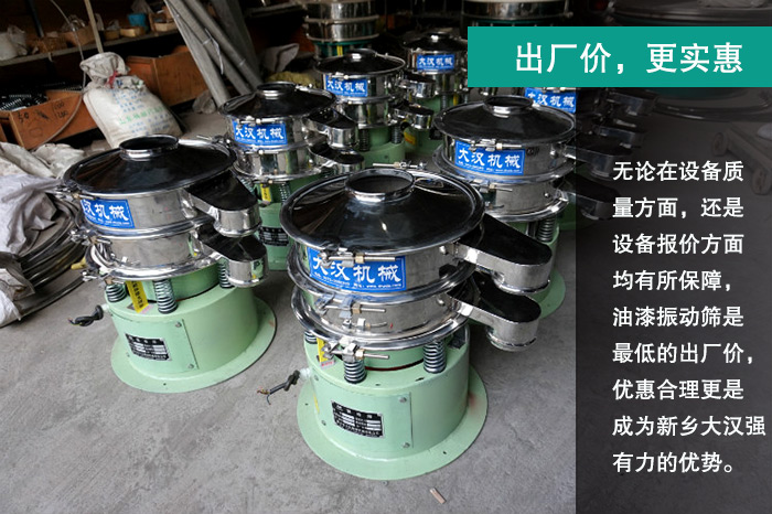 用戶都希望以較低的價(jià)格購(gòu)得較高質(zhì)量的產(chǎn)品,大漢作為直銷型廠家,無(wú)論在設(shè)備質(zhì)量方面,還是設(shè)備報(bào)價(jià)方面均有所保障,油漆振動(dòng)篩是低的出廠價(jià),優(yōu)惠合理更是成為新鄉(xiāng)大漢強(qiáng)有力的優(yōu)勢(shì)。