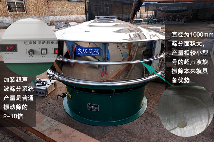 用戶購買一臺設(shè)備都是用來服務(wù)生產(chǎn)的,大漢一米超聲波旋振篩直徑為1000mm,篩分面積大,產(chǎn)量相較小型號的超聲波旋振篩本來就具備優(yōu)勢,再加上超聲波旋振篩家加裝了超聲波篩分系統(tǒng)(超聲波電源,超聲波換能器),產(chǎn)量是普通振動(dòng)篩的2-10倍,而且還可以有效分解篩上物,極大地增強(qiáng)了超聲波旋振篩的篩分精度與效率。
