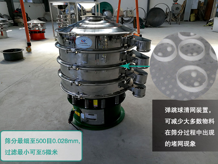 大漢多層三次元振動(dòng)篩可篩分顆粒狀、粉末狀、粘液類物料,篩分細(xì)至500目0.028mm,過濾小可至5微米,篩分精準(zhǔn),再加上多層三次元振動(dòng)篩特有的彈跳球清網(wǎng)裝置,可減少大多數(shù)物料在篩分過程中出現(xiàn)的堵網(wǎng)現(xiàn)象,提高篩分精度與篩分效率。