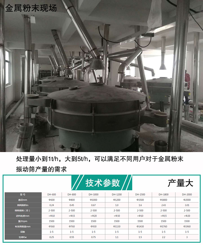 新鄉(xiāng)大漢金屬粉末振動(dòng)處理量小到1t/h,大到5t/h,可以滿足不同用戶對于金屬粉末振動(dòng)篩產(chǎn)量的需求。