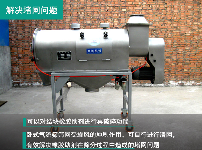 臥式氣流篩可以對結塊物料進行再破碎功能,特別適合篩分處理輕比重、粘度大、纖維多、有靜電、易團聚的超細微粉和特殊物料,而臥式氣流篩篩網受旋風的沖刷作用,可自行進行清網,有效解決橡膠助劑在篩分過程中造成的堵網問題。