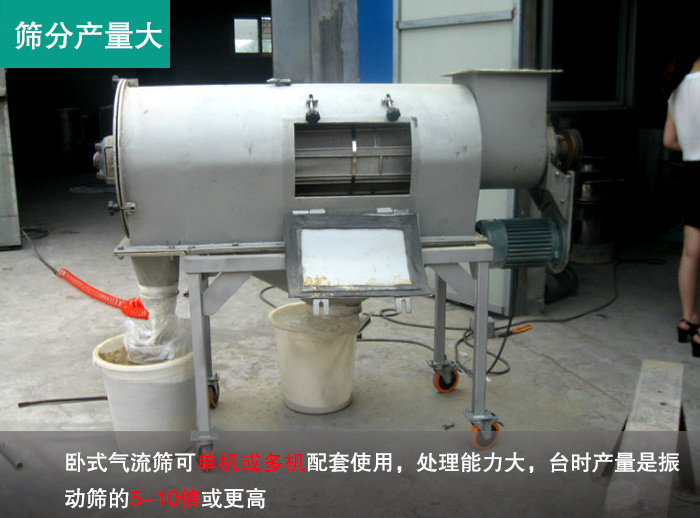 臥式氣流篩可對細度范圍在80-500目內的粉狀物料很好的連續(xù)篩分。臥式氣流篩整個篩分筒可以用密封隔離罩所密封,避免橡膠助劑在篩分循環(huán)過程中的粉塵飛揚,塊狀分濺等現(xiàn)象,影響篩分精度,而且在達到達到篩分精度的情況下,篩分效率可達到95%以上。