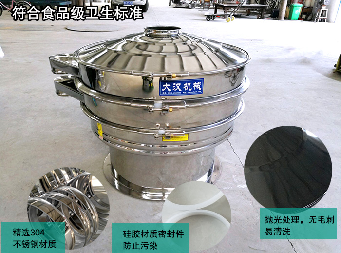 蛋糕粉終用于食品行業(yè),所以在選擇振動(dòng)篩設(shè)備是還要考慮其衛(wèi)生情況,大漢不銹剛振動(dòng)篩采用304不銹鋼材質(zhì),進(jìn)過(guò)嚴(yán)格的拋光處理,再加上其采用硅膠材質(zhì)的密封件,防止蛋糕粉在篩分過(guò)程中被外界環(huán)境所污染,完全符合食品衛(wèi)生標(biāo)準(zhǔn),用戶(hù)可以放心使用。