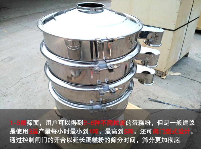 不銹鋼振動(dòng)篩篩面層數(shù)有1~5層,用戶(hù)可以得到2~6種不同粒度的蛋糕粉,但是一般建議是使用3層,產(chǎn)量每小時(shí)小到1噸,高到5噸,另外,為了更好地對(duì)蛋糕粉進(jìn)行篩分,大漢廠(chǎng)家還設(shè)計(jì)了閘門(mén)型旋振篩,用戶(hù)可以一次投料長(zhǎng)久篩分作業(yè),通過(guò)控制閘門(mén)的開(kāi)合以達(dá)到良好篩分的目的,篩分效率高。