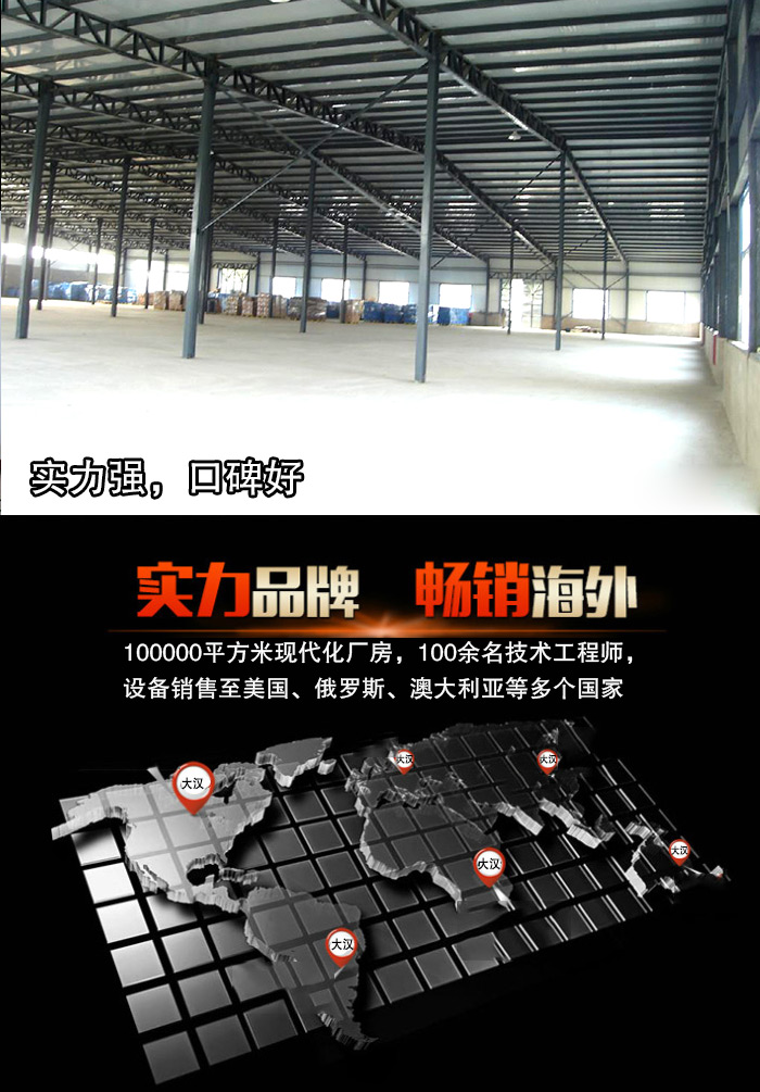 新鄉(xiāng)大漢擁有100000平方米現(xiàn)代化廠房,設(shè)備設(shè)施先進(jìn),100余名技術(shù)工程師,設(shè)備銷售至美國(guó)、俄羅斯、澳大利亞等多個(gè)國(guó)家,贏得了用戶的一致贊譽(yù)。