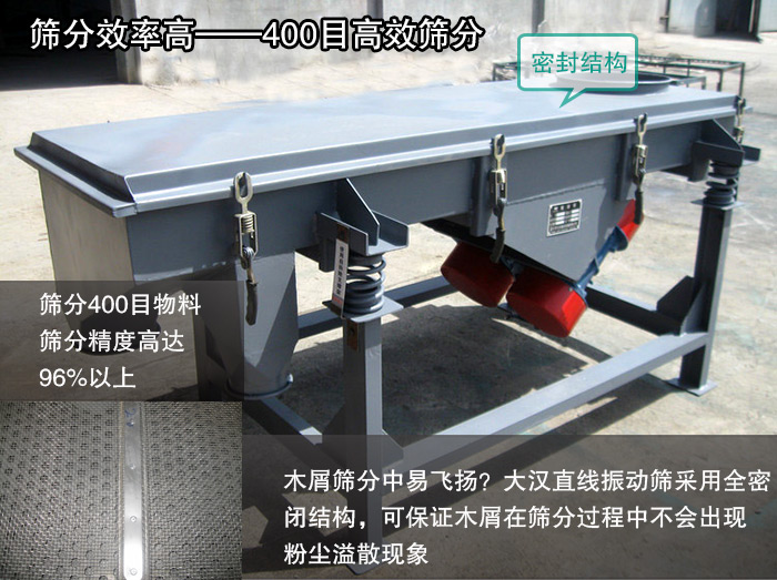直線(xiàn)振動(dòng)篩可以篩分400目物料,篩分精度高達(dá)96%以上,采用全密閉結(jié)構(gòu),可保證木屑在篩分過(guò)程中不會(huì)出現(xiàn)粉塵溢散現(xiàn)象,可以進(jìn)一步提高直線(xiàn)振動(dòng)篩篩分效率。